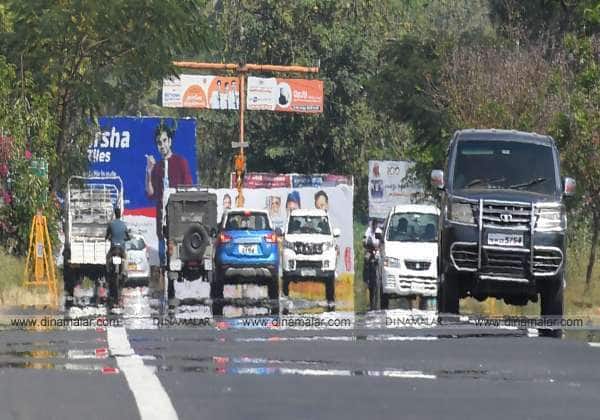 சுட்டெரிக்கும் வெயிலால் தேனி - போடி ரோட்டில் தென்பட்ட கானல் நீர்.
