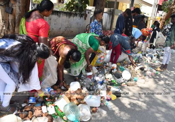 டெங்கு கொசு உற்பத்தி காரணிகளான தேங்காய் தொட்டி, பிளாஸ்டிக் பாட்டீல், டயர் உள்ளிட்ட பொருட்களை வீடுகளிலிருந்து அப்புறப்படுத்திய கொசு ஒழிப்பு பணியாளர்கள்.
