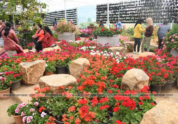 ஊட்டி பெர்ன்ஹில் பகுதியிலுள்ள கர்நாடக தோட்டக்கலைத்துறை பூங்காவில், ஜெரோனியா பூக்களை ரசித்து செல்லும் சுற்றுலா பயணிகள்,