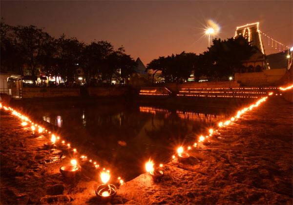 மகா சிவராத்திரி முன்னிட்டு, திருவண்ணாமலை அருணாசலேஸ்வரர் கோவில் ராஜகோபுரம் அருகே உள்ள சக்கரகுளத்தில் லட்சத்தீபம் ஏற்றப்பட்டது.