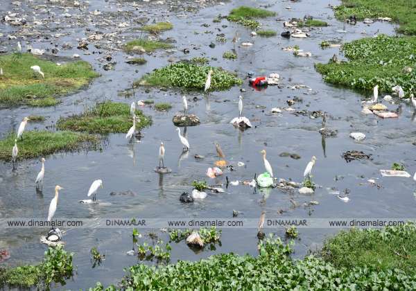 இரை தேடி சென்னை திருவேற்காடு பகுதி வழியாக செல்லும் கூவம் ஆற்றில் இரை தேடி அமர்ந்துள்ள கொக்குகள்