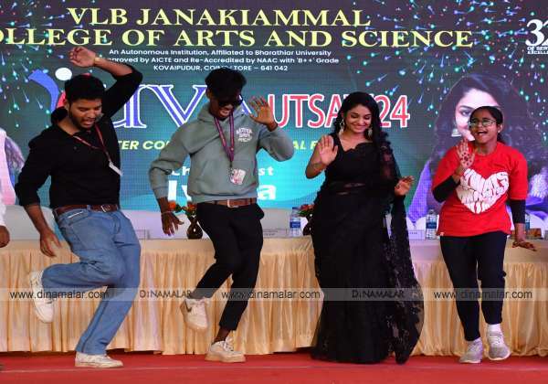 உற்சாக நடனம்கோவைப்புதூர் வி.எல்.பி., ஜானகியம்மாள் கலை அறிவியல் கல்லூரி நடந்த யுவா உட்சவ் கலை விழாவில் மாணவர்களுடன் உற்சாக நடனம் ஆடிய திரைப்பட நடிகை இவானா .