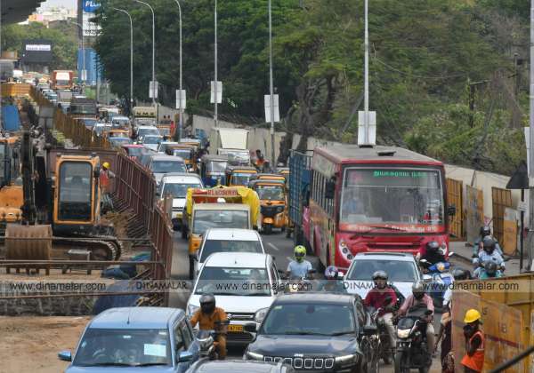 சென்னை, மவுண்ட் - பூந்தமல்லி நெடுஞ்சாலையில் மெட்ரோ பணிகள் நடந்து வருவதால் போக்குவரத்து நெரிசலில் சிக்கி ஊர்ந்து செல்லும் வாகனங்கள்.இடம்: நந்தம்பாக்கம்.