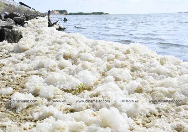 தனுஷ்கோடி கோதண்டராமர் கோயில் அருகில் நீர் பிடிப்பு பகுதியில் கரை ஒதுங்கிய ரசாயன நுரை.