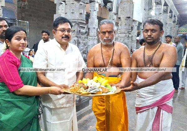 திருவண்ணாமலை அருணாசலேஸ்வரர் கோவிலுக்கு, டிடிவி தினகரன் குடும்பத்துடன் சாமி தரிசன செய்தனர். கோவில் சார்பில் குருக்கள் பிரசாதம் வழங்கினார்.