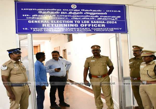 லோக்சபா தேர்தலை முன்னிட்டு வேட்புமனு தாக்கல் துவங்கிய நிலையில் திருப்பூர், கலெக்டர் அலுவலக வளாகத்தில் பலத்த போலீஸ் பாதுகாப்பு போடப்பட்டுள்ளது.