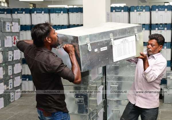 லோக்சபா தேர்தலை ஒட்டி அந்தந்த வாக்குச்சாவடிகளுக்கு மின்னணு இயந்திரங்களை சரிபார்த்து அனுப்பப்பட்டது. இடம் கோவை தெற்கு தாலுகா அலுவலகம்