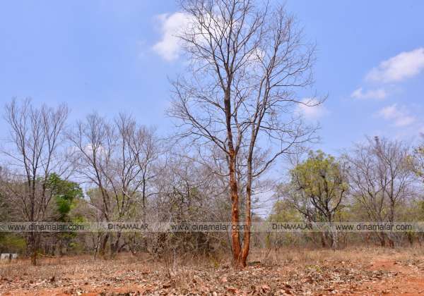 கொடை வெயிலில் மரங்களில் இலைகள் உதிர்ந்து காட்சியளித்தது. இடம்: சிவகங்கை நகராட்சி பூங்கா