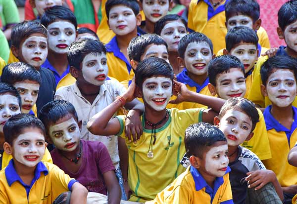 சர்வதேச ஹேப்பி தினத்தை முன்னிட்டு மாணவர்கள் வேடமிட்டு சிரித்து அசத்தினர்.