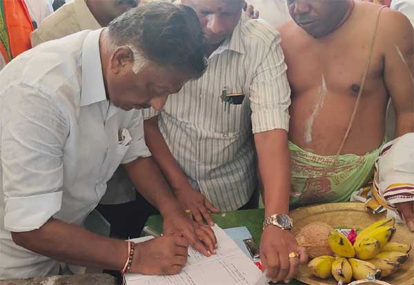 பா.ஜ., கூட்டணியில் ராமநாதபுரம் தொகுதியில் போட்டியிடும் ஓ.பன்னீர்செல்வம் மருச்சுக்கட்டு செல்வ விநாயகர் கோயிலில் வேட்பு மனு படிவத்தில் கையெழுத்திட்டார்.