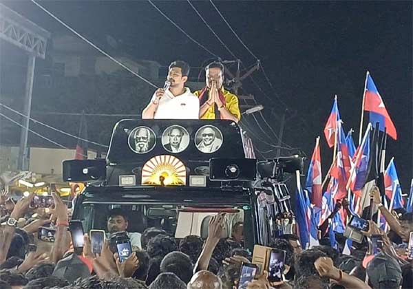 லோக்சபா தேர்தலையொட்டி திருவண்ணாமலை மாவட்டம் செய்யார் பகுதியில், ஆரணி தொகுதியில் போட்டியிடும் தி.மு.க., வேட்பாளர் தரணிவேந்தனை ஆதரித்து அமைச்சர் உதயநிதி ஸ்டாலின் பிரசார வாகனத்தில் இருந்த படி பேசினார்.