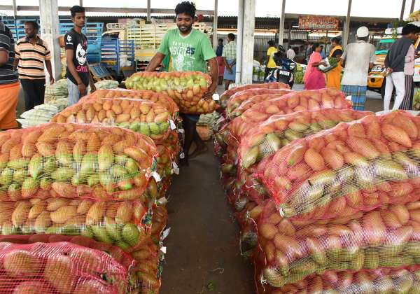 மாங்காய் சீசன் துவங்கியதையடுத்து திருப்பூர், தினசரி மார்க்கெட்டில் மாங்காய் முட்டைகள் விற்பனைக்கு அடுக்கி வைக்கப்பட்டுள்ளது.