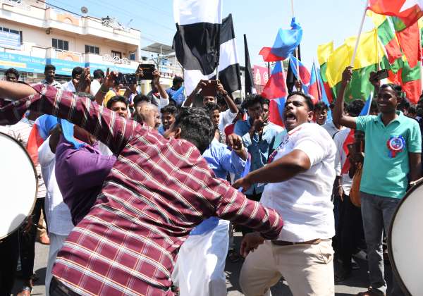 விழுப்புரம் லோக்சபா தொகுதி வி.சி., கட்சி வேட்பாளர் ரவிக்குமாரை ஆதரித்து அக்கட்சியின் தலைவர் வரும் போது மேளம் அடிக்கடி இசைக்கு ஏற்றவாறு ஆடும் தொண்டர்கள்.