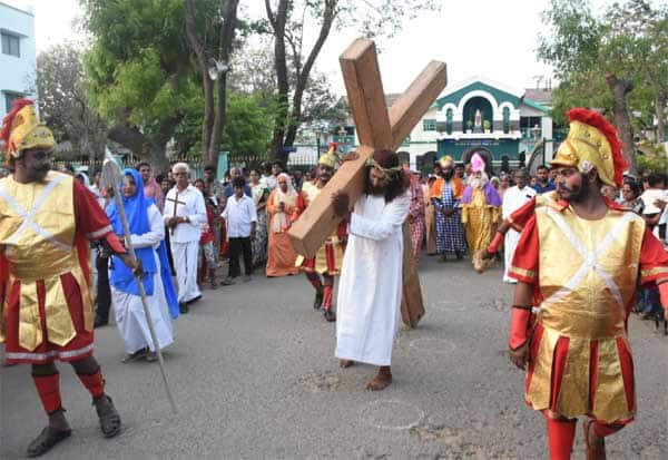 புனித வெள்ளியை ஒட்டி, சேலம் நான்கு ரோடு குழந்தை இயேசு பேராலயத்தில் இயேசு சிலுவையில் அறையப்படும் போது நடந்த நிகழ்வுகளை நடித்துக் காட்டிய கிறிஸ்தவர்கள்.