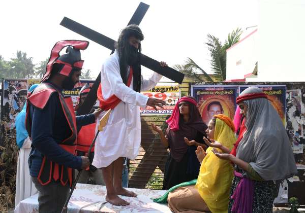 சிலுவைப்பாதையில் இயேசு கிறிஸ்து பட்ட பாடுகள் வடிவில் நின்ற இளைஞர்கள். இடம்: கோவை போத்தனூர் வெள்ளலூர் ரோடு.