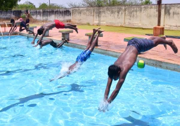 கோடை வெயிலின் தாக்கத்தை தனிக்க இளைஞர்கள் சிவகங்கை மாவட்ட விளையாட்டு மைதானத்தில் உள்ள நீச்சல் குளத்தில் ஆனந்த குளியல் போட்டனர்.