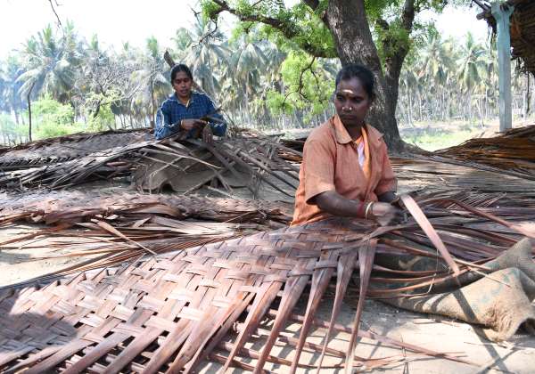 உடுமலை ஜல்லிப்பட்டியில் தென்னை ஓலையால் கிடுகு பின்னுதலில் ஈடுபட்டுள்ள தொழிலாளர்கள்.