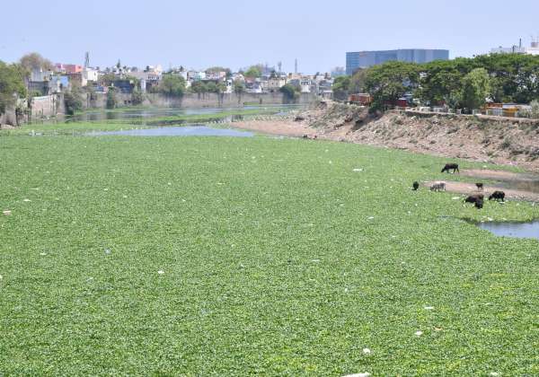 சென்னை, அடையாறு ஆற்றை ஆக்கிரமித்து படர்ந்துள்ள ஆகாயத்தாமரை செடிகள்.இடம்: ஈக்காட்டுதாங்கள்.