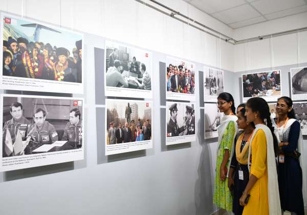 சென்னை, தேனாம்பேட்டை ரஷ்யன் கலாச்சார மையத்தில், இந்திய விண்வெளி வீரரின் முதல் விண்வெளி பயணத்தின் 40 ஆண்டுகள் என்ற புகைப்படக் கண்காட்சியை ஆர்வமுடன் பார்வையிட்ட மாணவியர்.