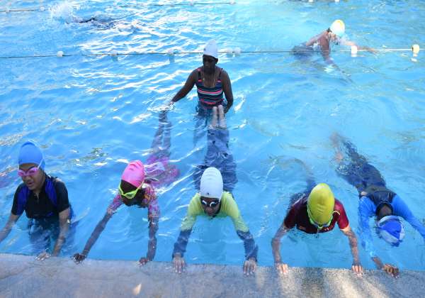 அரசு விளையாட்டு துறையின் சார்பில் துவங்கியுள்ள கோடை கால நீச்சல் பயிற்சி முகாமில் பங்கேற்றுள்ள சிறுமியர். இடம்: செனாய் நகர்.