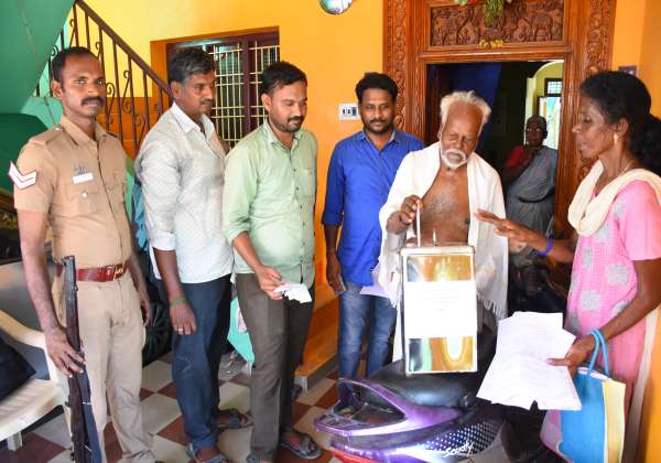 விழுப்புரம் லோக்சபா தொகுதி திண்டிவனம் அடுத்த ரோசனையில் வீடு வீடாக சென்று 85 வயது மற்றும் மாற்றுத்திறனாளிகள் தபால் ஓட்டு பெறுவதற்காக துப்பாக்கி ஏந்திய போலீஸ் பாதுகாப்புடன் வாக்களித்த முதியோர்.