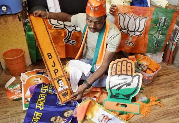 தேர்தலை முன்னிட்டு கட்சி கொடிகள் மற்றும் பேட்ஜ்கள் விற்பனையில் மும்முரமாக ஈடுபட்டுள்ள வியாபாரி.