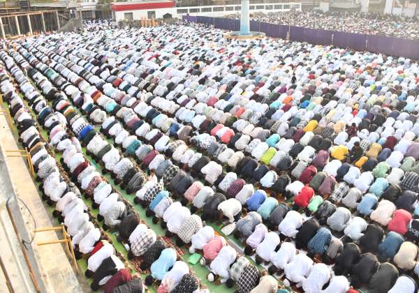 ரமலான் பண்டிகையை முன்னிட்டு கோவை குனியமுத்தூரிலுள்ள ஆயிஷா மஹாலில் தொழுகையில் ஈடுபட்ட இஸ்லாமியர்கள்.