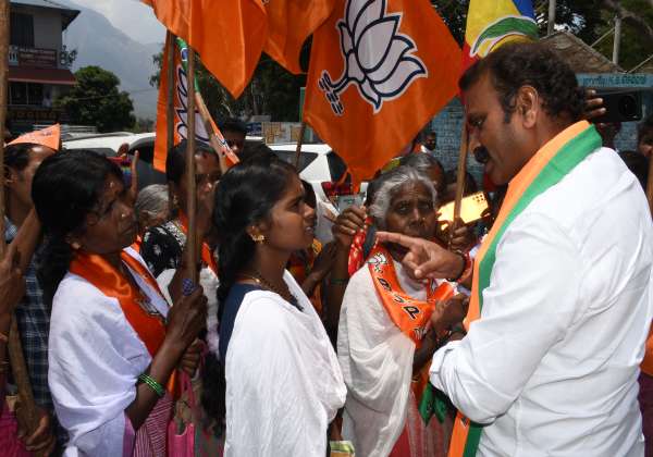நீலகிரி தொகுதி பா.ஜ., வேட்பாளர் முருகன் , மசினகுடியில் பெட்ட குரும்பர் பழங்குடியின பெண்களிடம் குறைகளை கேட்டார்.