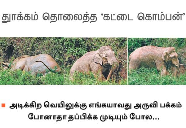 கூடலூர் கொளப்பள்ளி சின்ன ஆனைப்பள்ளம் டான் டீ தொழிலாளர்கள் குடியிருப்பு எதிரே, சுகமாக உறங்கிய கட்டை கொம்பன் யானை, வெயில் சூடேறியதால் மெதுவாக எழுந்து, சோம்பல் முறித்து அங்கிருந்து நகர்ந்தது.