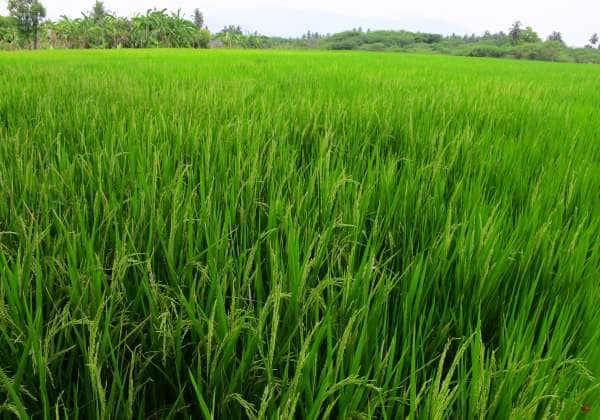 கோடை வெயில் தாக்கத்தில் கண்ணுக்கு குளிர்ச்சியூட்டம் வகையில் பசுமையாக காட்சியளிக்கும் நெல் வயல். இடம்: திண்டுக்கல்