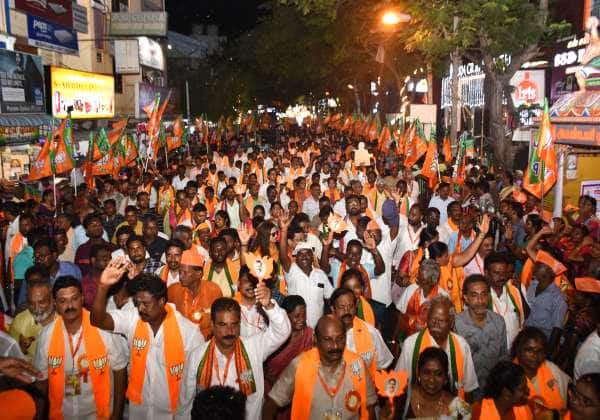 பாஜ.,வேட்பாளர் நமச்சிவாயத்தை ஆதரித்து புதுச்சேரி அண்ணா சாலையில் நடந்த ரோடு ஷோ, பிரச்சார நிகழ்ச்சியில் எம்.எல்.ஏ.,க்கள் ராமலிங்கம், கல்யாணசுந்தரம், ஜான் குமார், அசோக் பாபு மற்றும் திரளாக நடந்து வந்த பாஜ.,வினர்.