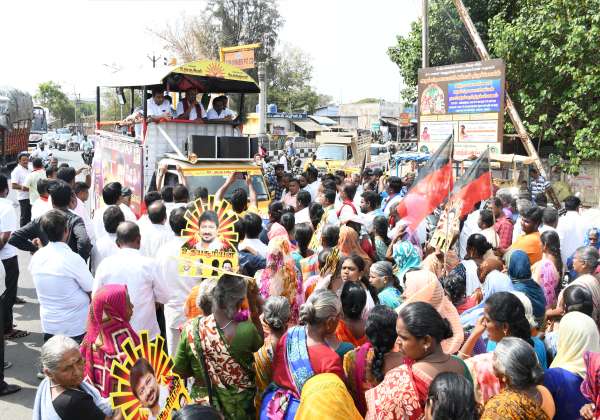 உடுமலை பஸ் ஸ்டாண்ட் முன்பு பொள்ளாச்சி லோக்சபா தொகுதி தி.மு.க., வேட்பாளர் ஈஸ்வரசாமி உதயசூரியன் சின்னத்திற்கு ஓட்டு கேட்டு தேர்தல் பிரசாரம் செய்தார்
