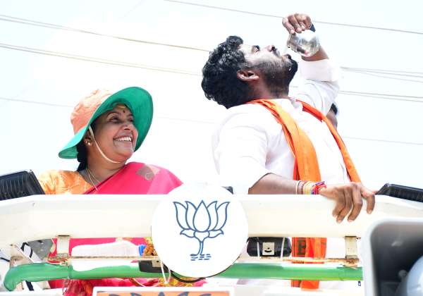 இறுதி கட்ட சூறாவளி பிரசாரத்தில் கோவை காந்திமா நகர் பகுதியில் பா.ஜ., வேட்பாளர் அண்ணாமலை மோர் குடித்தார். அருகில் எம்எல்ஏ வானதி சீனிவாசன்
