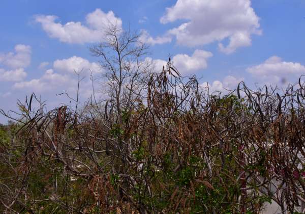 வெயிலின் தாக்கம் காரணமாக, மரங்களில் கிளைகள் உதிர்ந்து கருகி வருகிறது .இடம்: சிவகங்கை