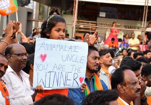 நீங்கதான் ஜெயிக்கப் போறீங்க அண்ணாமலை அங்கிள் என்று சிறுமி பதாகை காட்டினார்.
