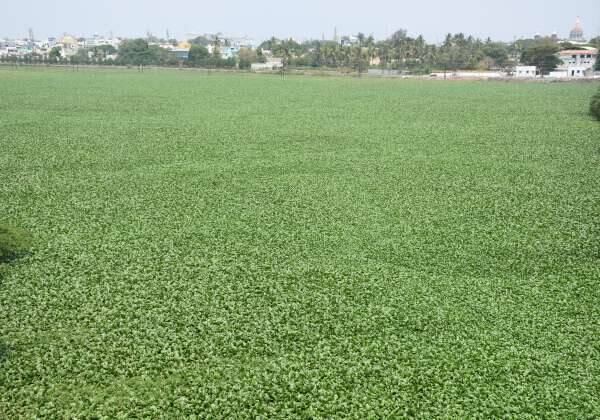 ஆகாயத் தாமரை படர்ந்து காட்சி அளிக்கும் கோவை உக்கடம் சின்ன குளம்.