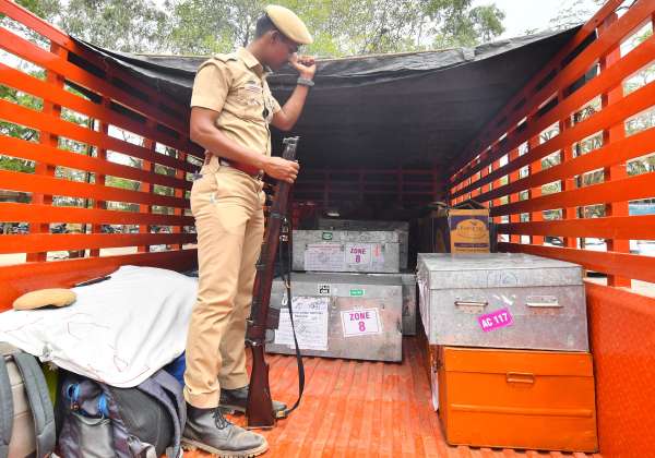 ஓட்டுச்சாவடிகளுக்கு ஓட்டு பெட்டிகள் போலீஸ் பாதுகாப்புடன் கொண்டு செல்லப்பட்டது. இடம்: கோவை காந்திபுரம்.