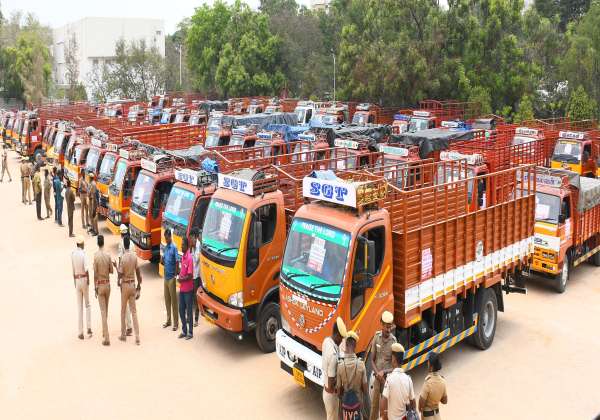 ஓட்டுசாவடிகளுக்கு ஓட்டு பெட்டிகள் எடுத்து செல்ல கோவை பி.ஆர்.எஸ்., மைதானத்தில் தயாராக நின்ற வாகனங்கள்.