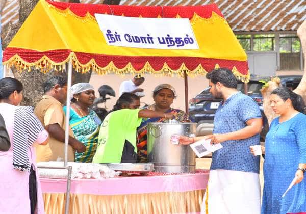 கோடை வெயிலில் கோவையில் ஆர்வமுடன் ஓட்டளிக்க வந்த மக்களுக்காக ஓட்டு சாவடிகளில் வைக்கப்பட்ட நீர் மோர். இடம்: வடவள்ளி மருதமலை தேவஸ்தான பள்ளி.