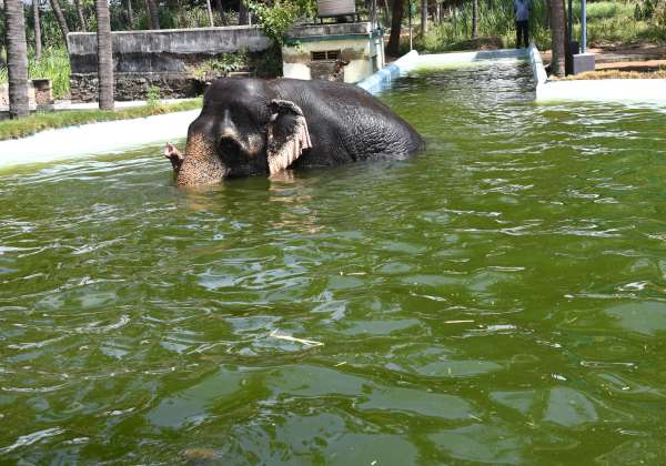 கோடை வெயிலை தணிக்கும் வகையில் நீச்சல் குளத்தில் குளித்து மகிழ்ந்த திண்டுக்கல் மாவட்டம் பழநி முருகன் கோயில் யானை கஸ்தூரி.