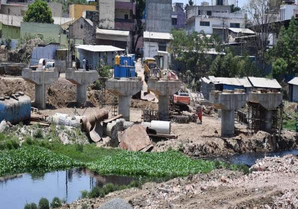 சென்னை மதுரவாயல் கூவம் ஆற்றின் குறுக்கே மேம்பாலம் கட்டும் பணி நடந்து வருகிறது.