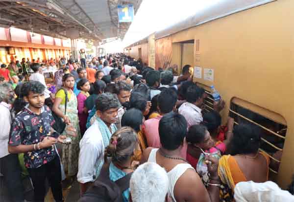 திருவண்ணாமலையில் கிரிவலம் முடிந்து, ஊர் திரும்ப ரயிலில் ஏறும் மக்கள்.