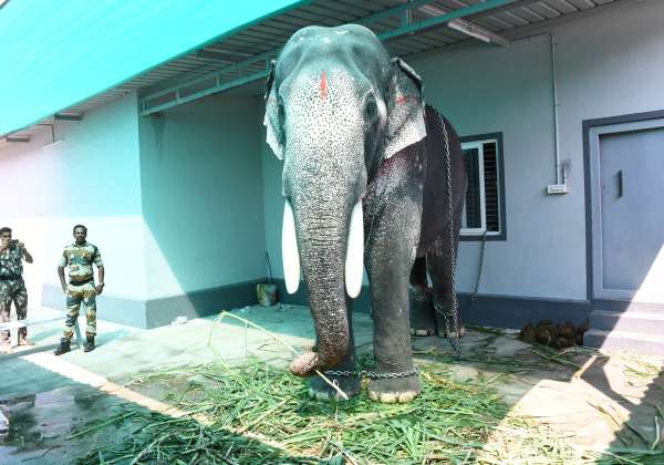 உடுமலை மாரியம்மன் கோயில் திருவிழாவில் தேரை தள்ளுவதற்காக கேரள மாநிலம் கோட்டயத்திலிருந்து வந்துள்ள யானை சாது .