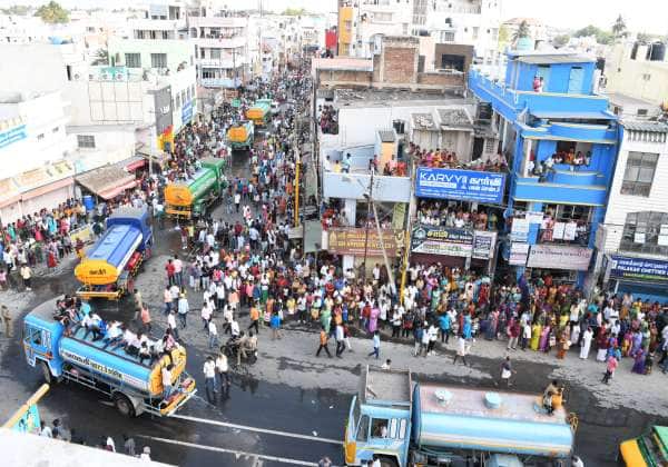 உடுமலை மாரியம்மன் கோவில் தேர் திருவிழாவை காண வரும் பக்தர்கள் கால் சுடாமல் இருக்க வரிசையாக டேங்கர் லாரிகள் மூலம் ரோடுகளில் தண்ணீர் தெளிக்கப்படுகிறது.