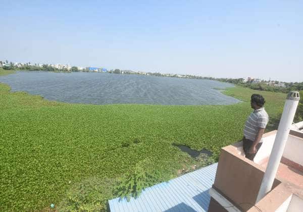 வேங்கைவாசல் ஏரியின் முழுவதும் படர்ந்துள்ள ஆகாயத்தாமரை செடிகள்