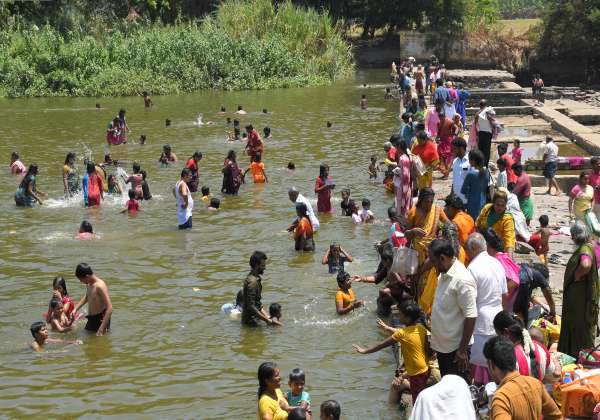 விடுமுறை நாளை முன்னிட்டு சுட்டெரிக்கும் கோடை வெயிலில் உடல் உஷ்ணத்தை தணிக்க முல்லைப்பெரியாற்றில் குவிந்த பொதுமக்கள். இடம் : வீரபாண்டி.