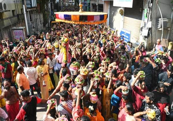 சென்னை மயிலாப்பூர் கோலவிழி அம்மன் கோவில் 1008 பால்குட திருவிழாவை முன்னிட்டு கபாலீஸ்வரர் கோவில் இருந்து கோலவிழி அம்மன் கோவில் வரை ஏராளமான பக்தர்கள் பால்குடம் ஏந்தி ஊர்வலம் சென்றனர்.