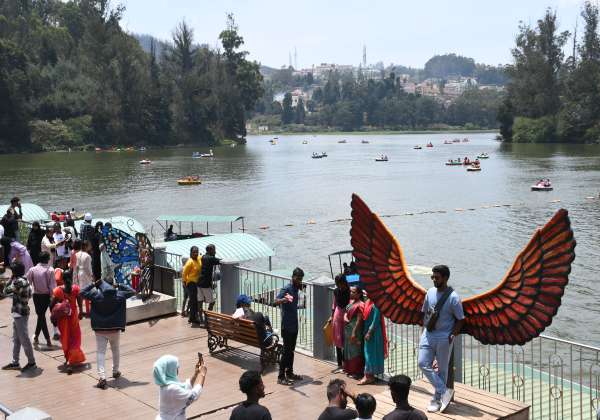 ஊட்டி படகு இல்லத்தில், செல்பி எடுத்து செல்லும் சுற்றுலா பயணிகள்.