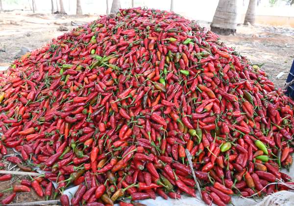 மிளகாய் செடிகளிருந்து பறிக்கப்பட்ட காய்களை தரம் பிரிப்பதற்காக விவசாயிகள் கொட்டி வைத்துள்ளனர். இடம்.உடுமலை பெரியக்கோட்டை
