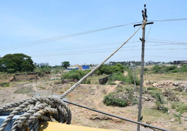 குன்றத்தூர் அருகே செம்பரம்பாக்கம் ஏரியின் உபரி நீர் செல்லும் புதிய பாலத்தின் கீழ் உள்ள மின்கம்பம் சாய்ந்து விழாமல் இருக்க கயிறு மூலம் பாலத்தின் மீது கட்டி வைக்கப்பட்டுள்ளது